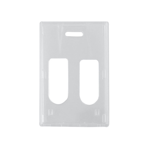RigidWear vertical 2 card badge holder. Clear rigid plastic with slot and thumb notches on both sides. Holds 2 30 mil (750mic) cards. Can be custom printed.